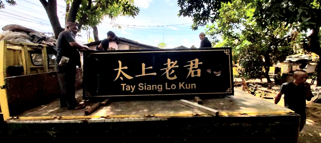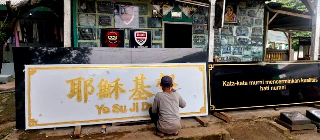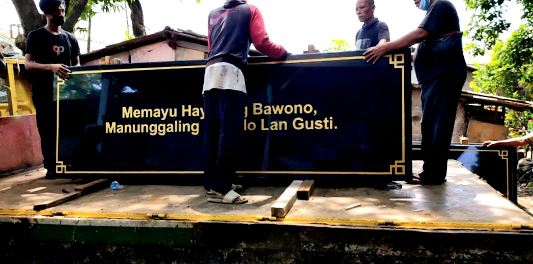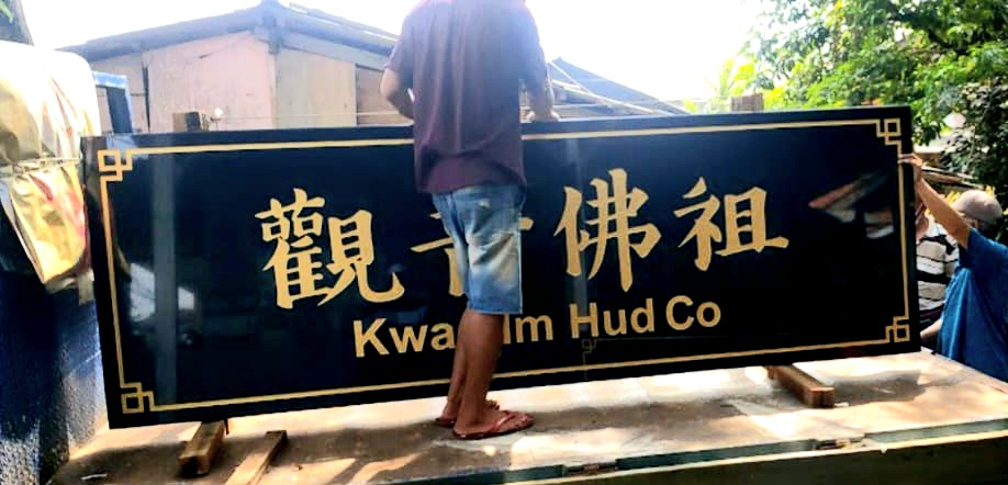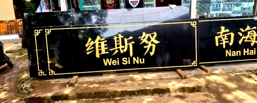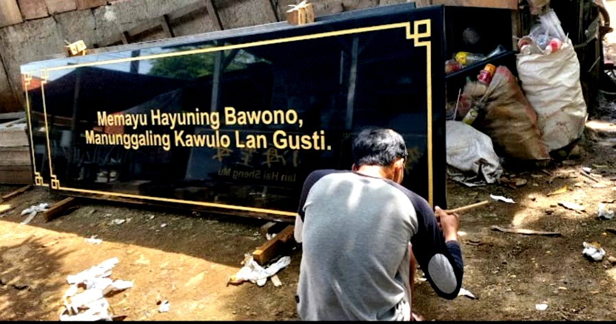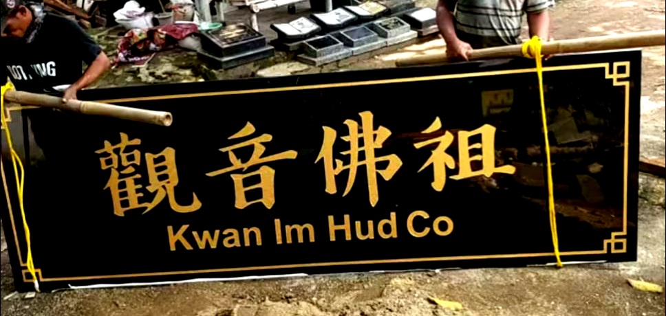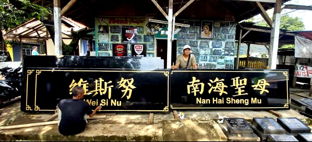 Ibenk grafir indonesia mengerjakan prasasti plang klenteng dari media granit dan tinta emas yang berkualiatas dengan mesin samblasting sehingga ukiran lebih dalam rapih ukuran 100 x 300