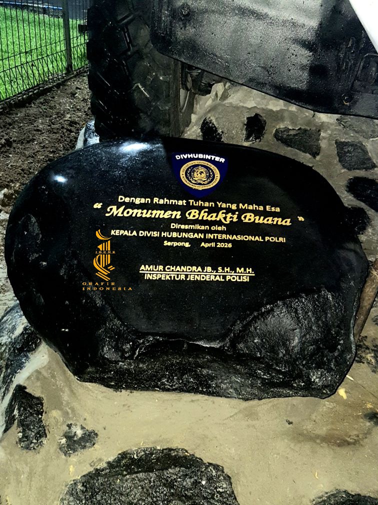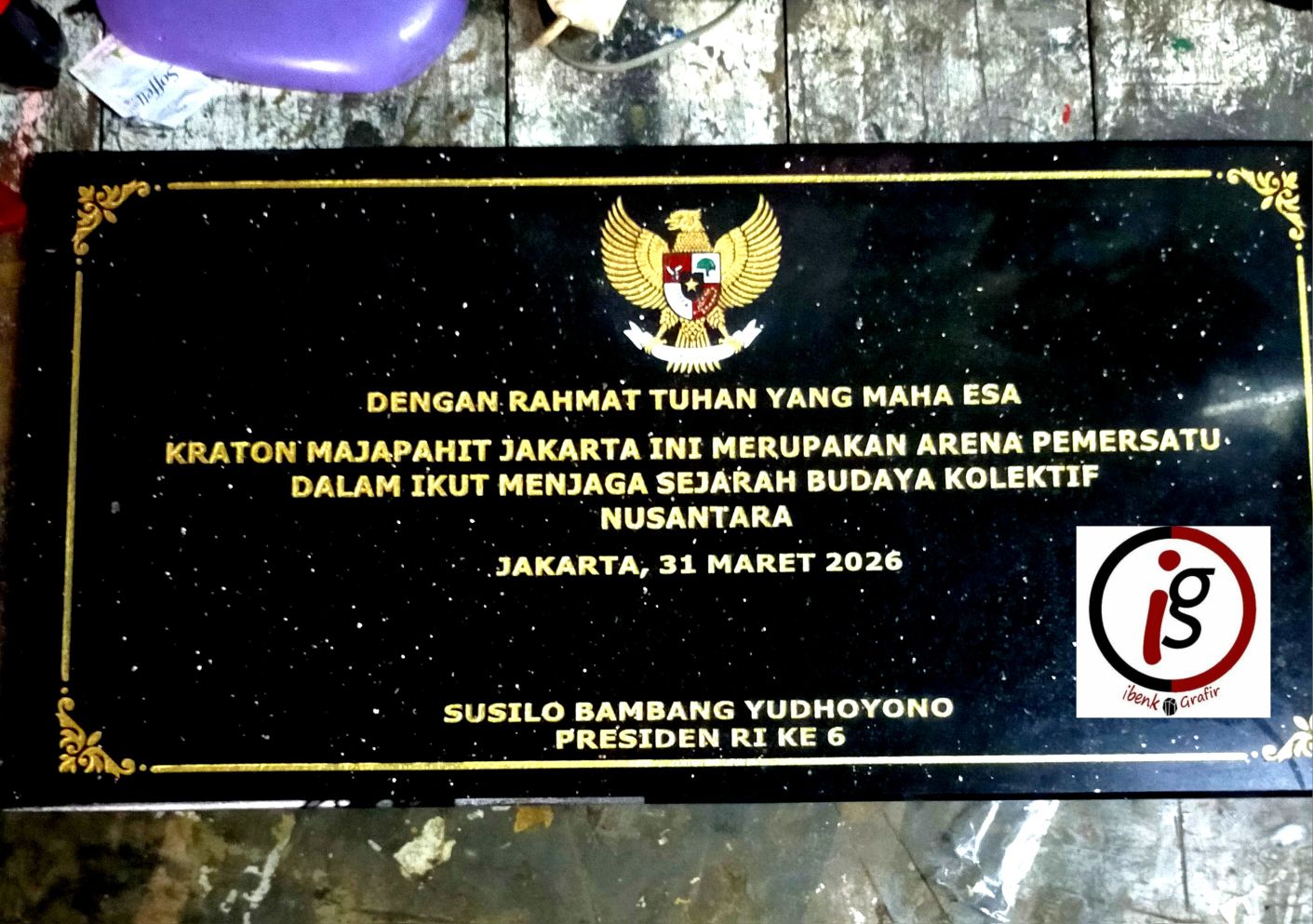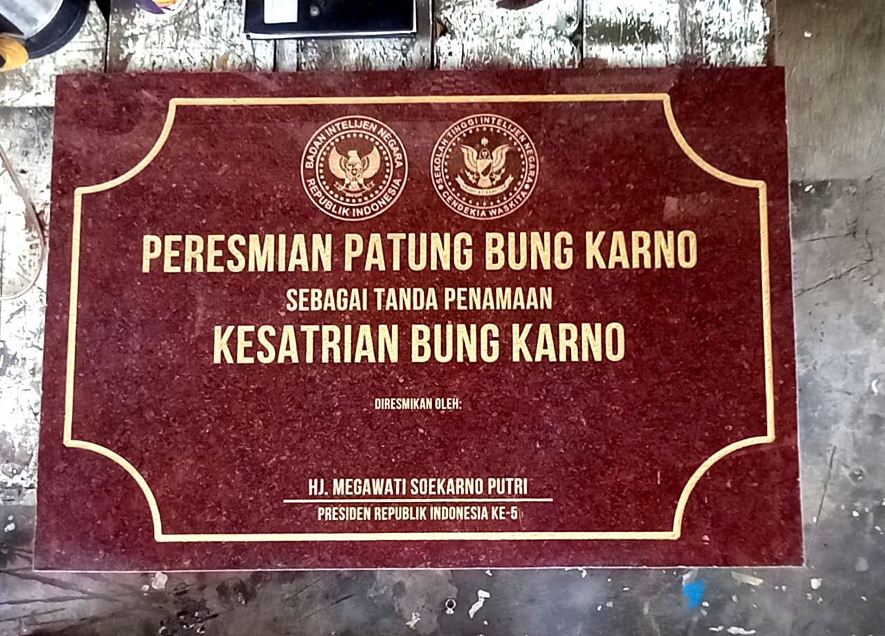 Ibenk grafir indonesia mengerjakan prasasti peresmian dari media granit dan tinta emas yang berkualiatas dengan mesin samblasting sehingga ukiran lebih dalam rapih ukuran 50 x 90