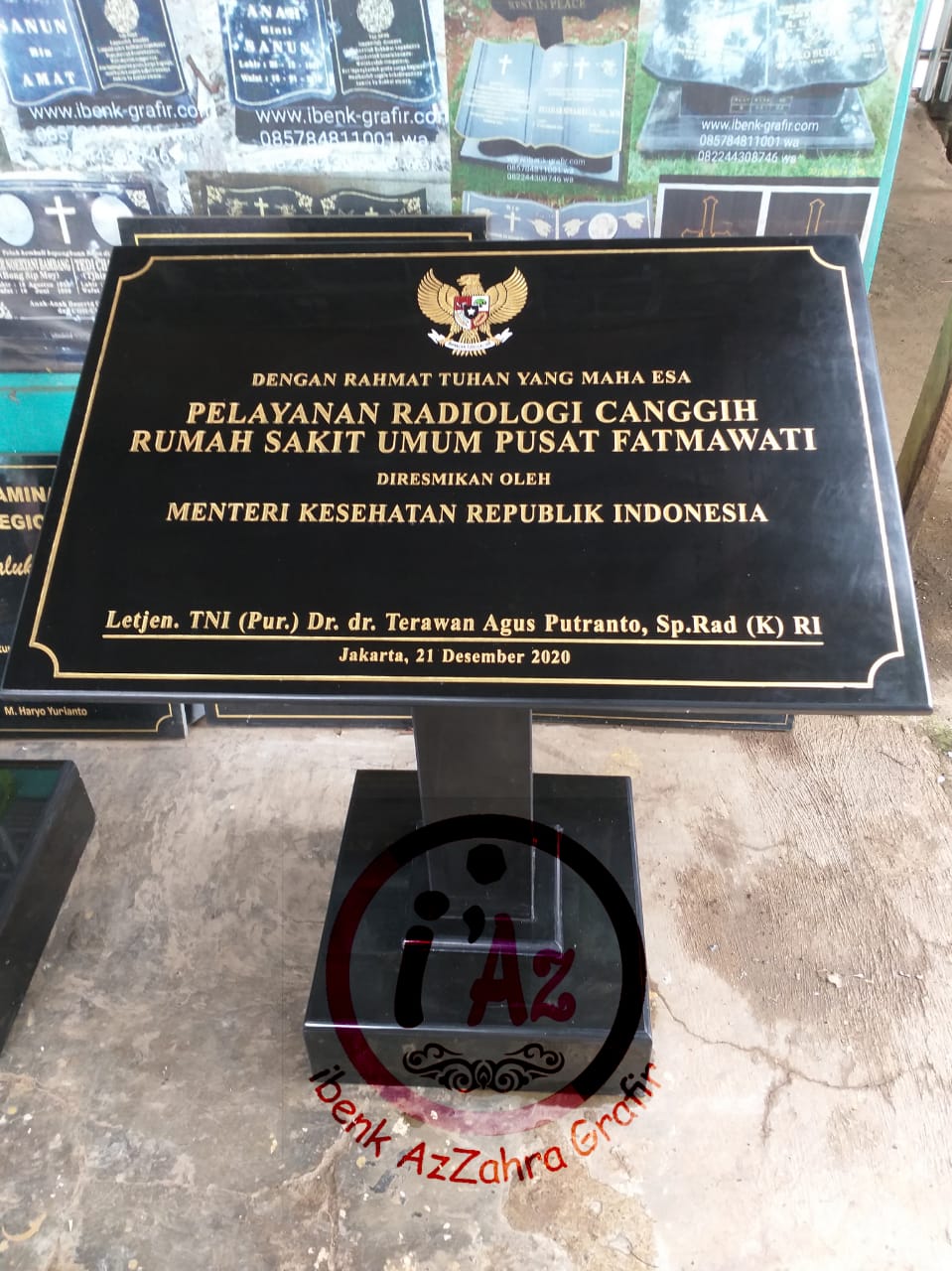 Ibenk grafir indonesia mengerjakan prasasti peresmian gedung plus stand podium dari media granit dan tinta emas yang berkualiatas dengan mesin samblasting sehingga ukiran lebih dalam rapih