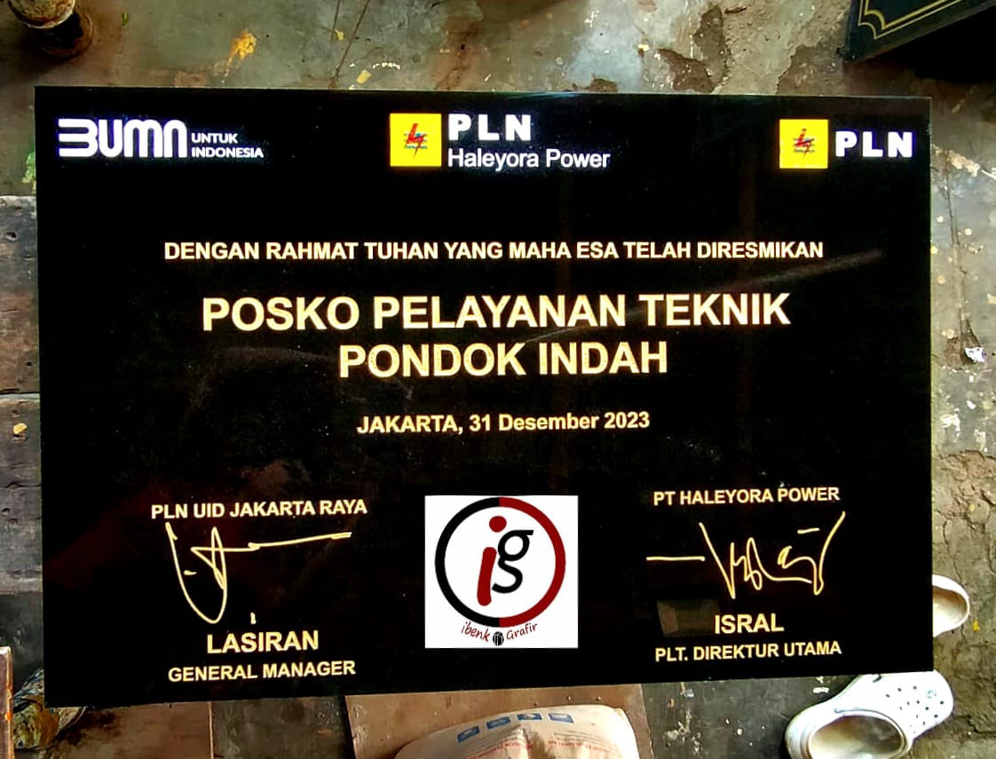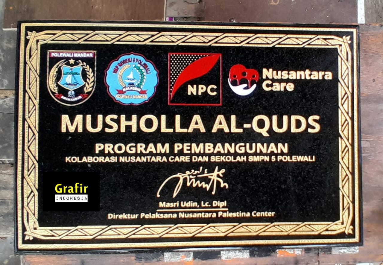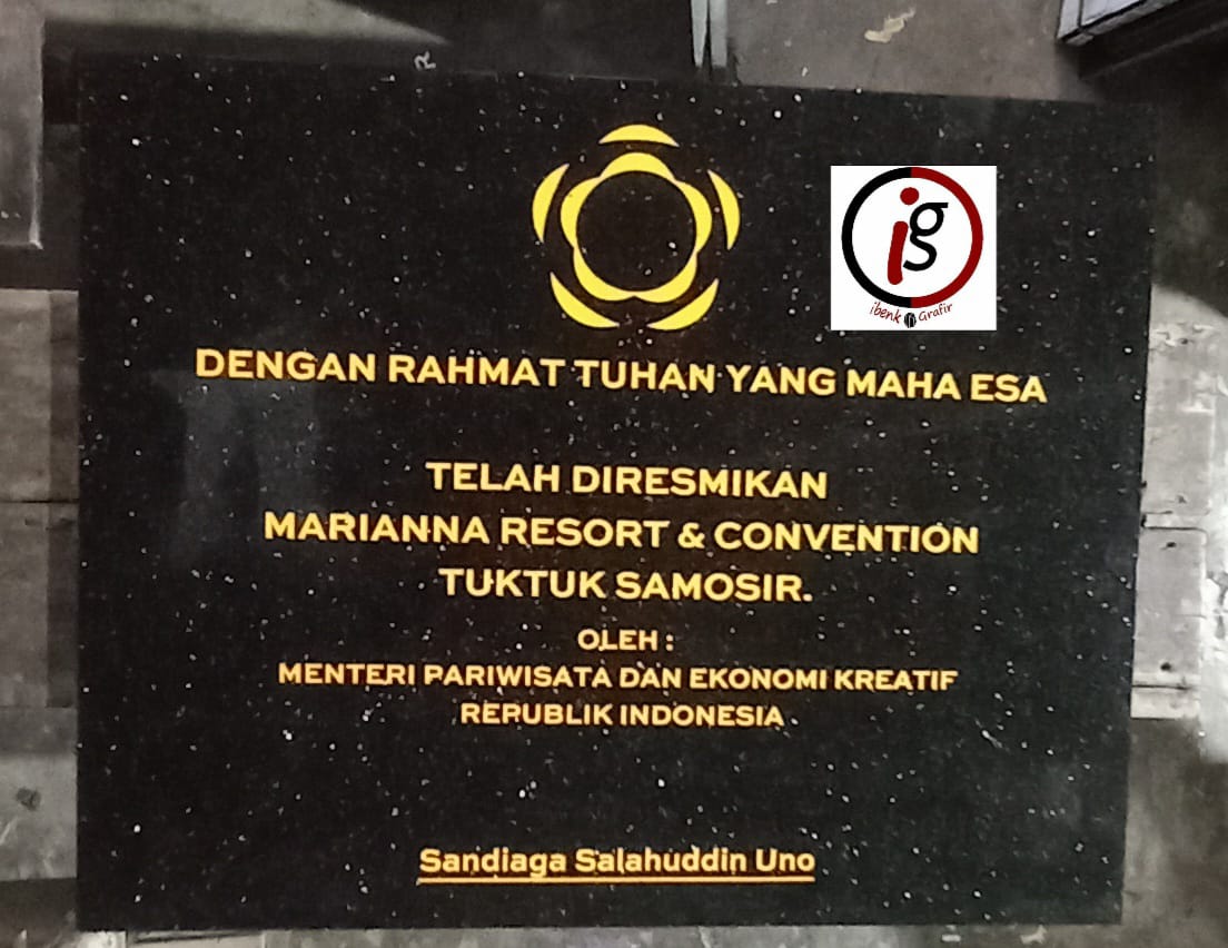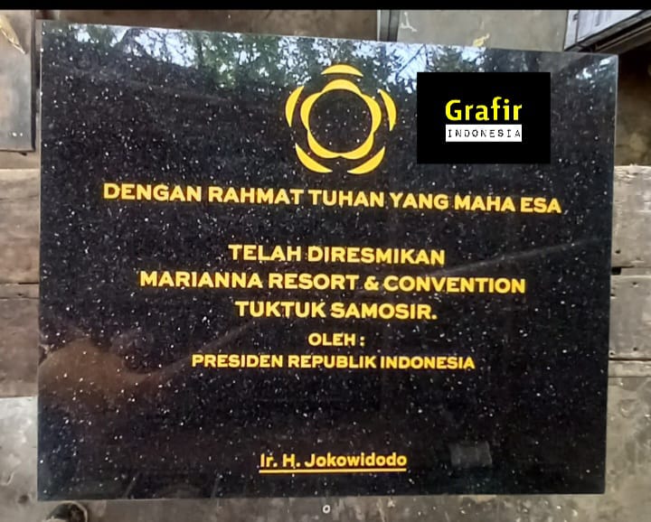 Ibenk grafir indonesia mengerjakan prasasti peresmian gedung dari media granit dan tinta emas yang berkualiatas dengan mesin samblasting sehingga ukiran lebih dalam rapih ukuran 60 x 90