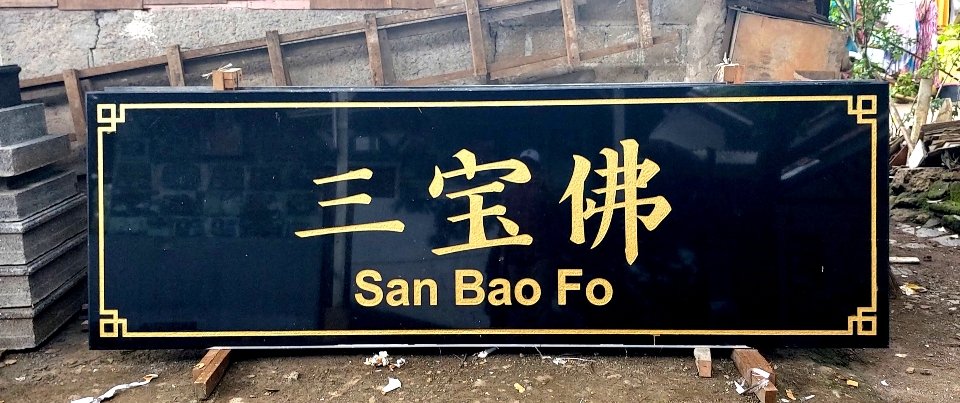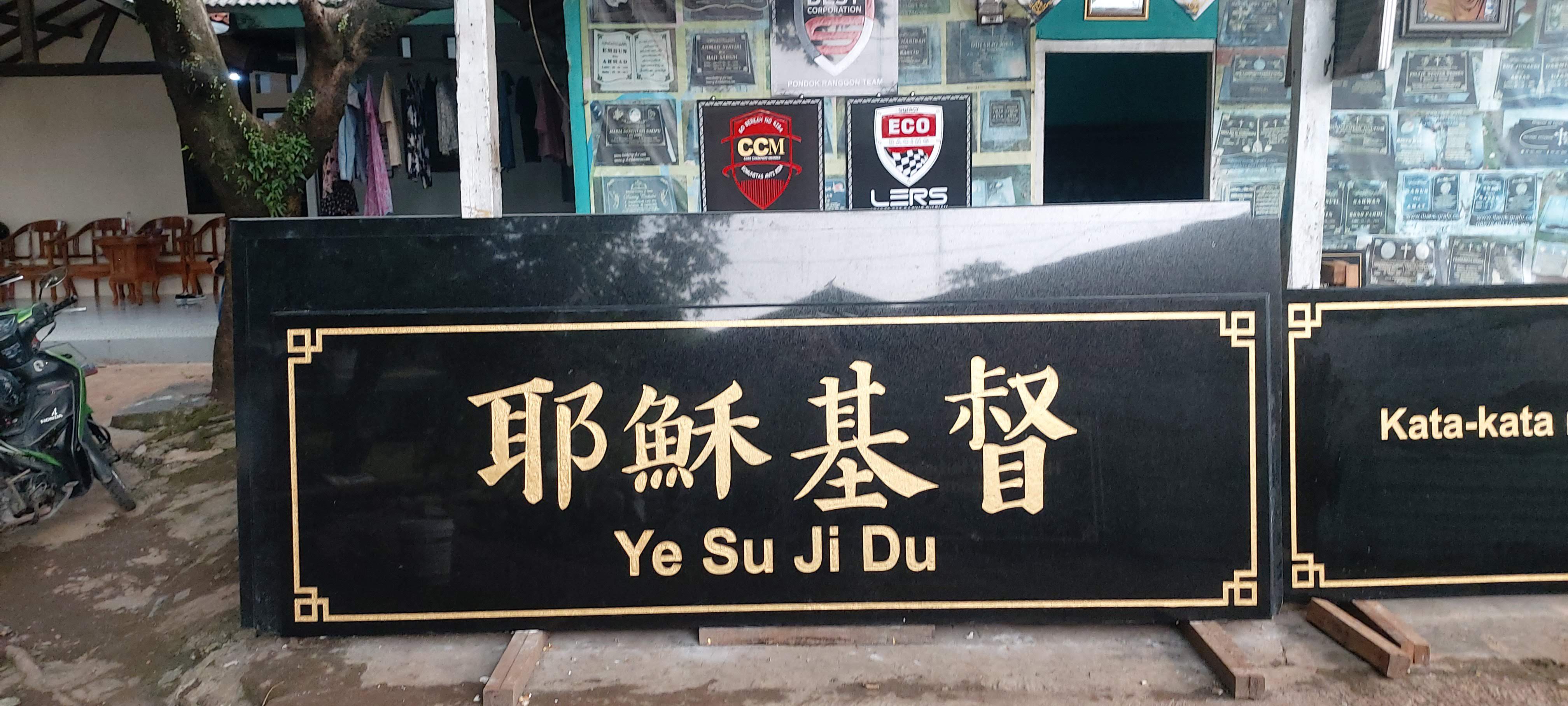 Ibenk grafir indonesia mengerjakan prasasti plang klenteng dari media granit dan tinta emas yang berkualiatas dengan mesin samblasting sehingga ukiran lebih dalam rapih ukuran 100 x 300