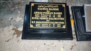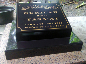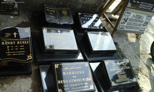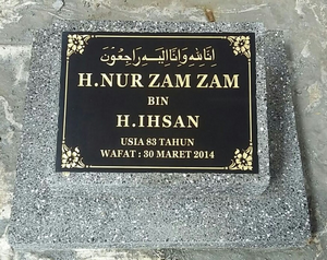 Ibenk grafir indonesia mengerjakan bangunan makam dari media granit dan tinta emas yang berkualiatas dengan mesin samblasting sehingga ukiran lebih dalam rapih ukuran 60 x 90