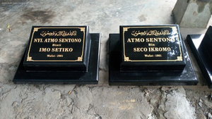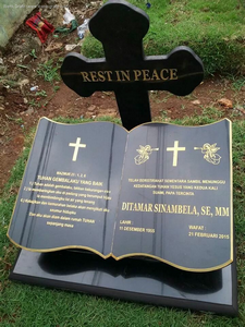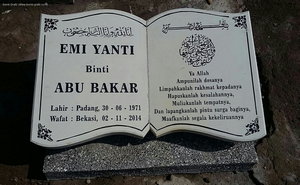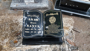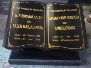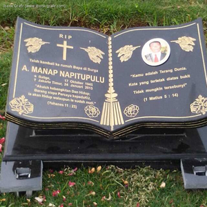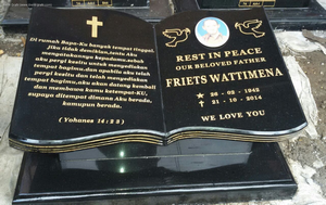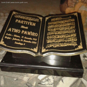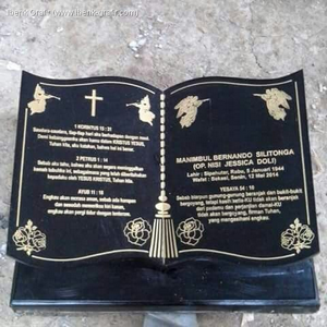 Ibenk grafir indonesia mengerjakan Batu Nisan Motif Buku dari media granit dan tinta emas yang berkualiatas dengan mesin samblasting sehingga ukiran lebih dalam rapih Ukuran: 30 x 40